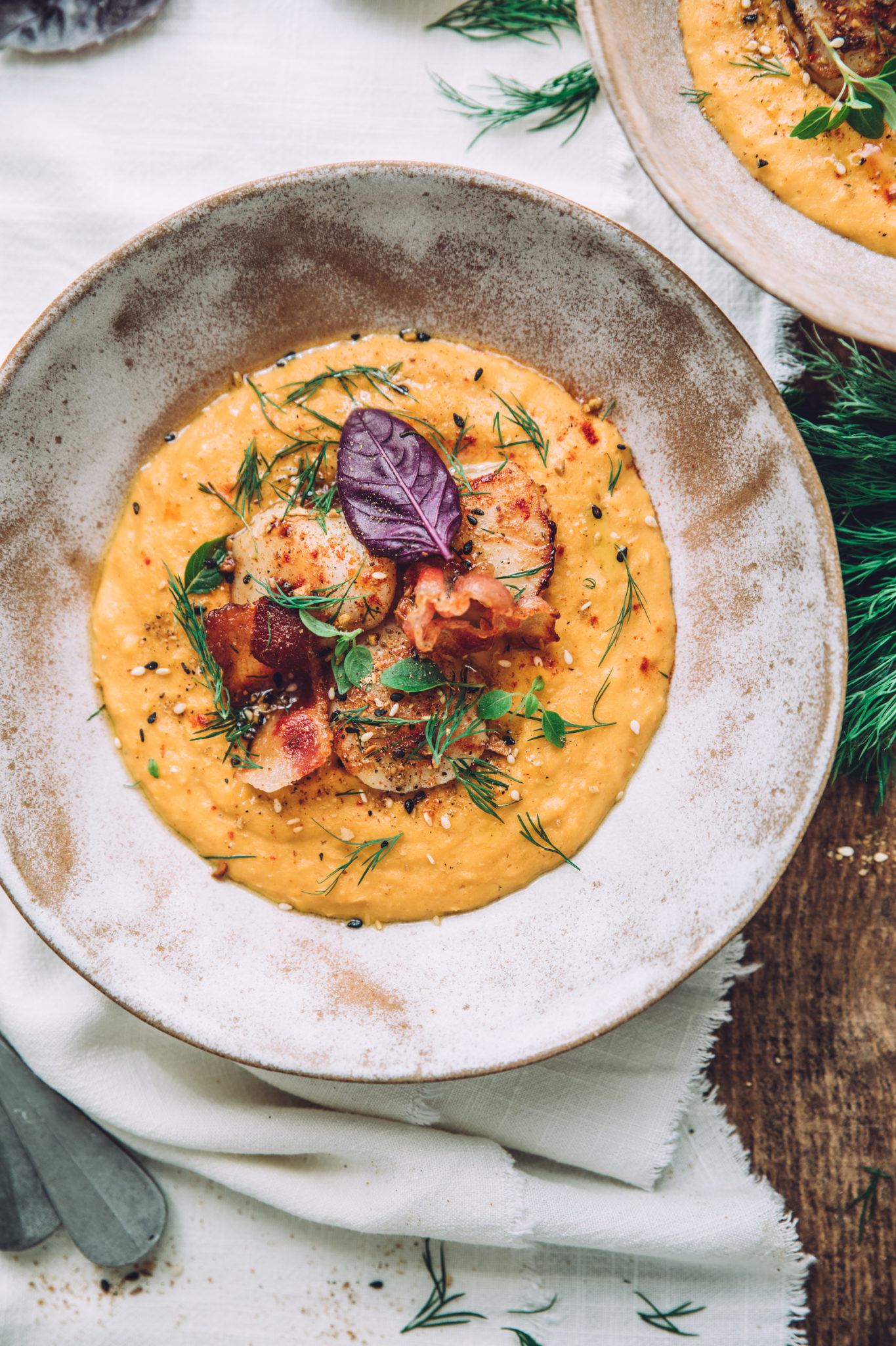 13/04/2021C’est l’histoire d’une recette totalement improvisée, qui finit en gros coup de coeur ! Quelques restes du placard, 20 minutes plus tard le déjeuner est servi ! Je vous présente une crème de maïs / coco / paprika fumé, accompagnée de Saint Jacques rôties et Guanciale. Le combo est parfait; et surtout ne nécessite que quelques minutes de préparation pour un résultat bien gourmand !